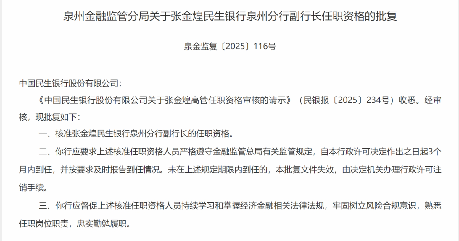 正规实盘股票配资平台 张金煌获批担任民生银行泉州分行副行长